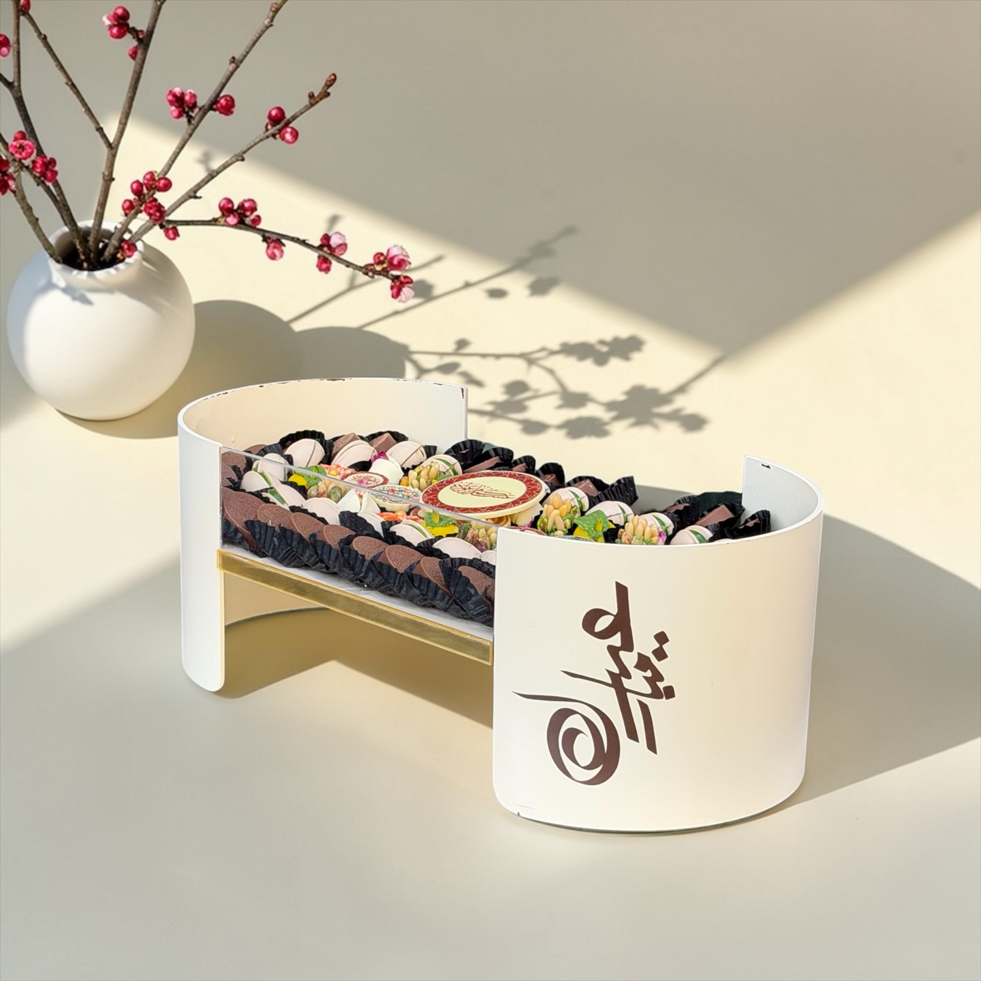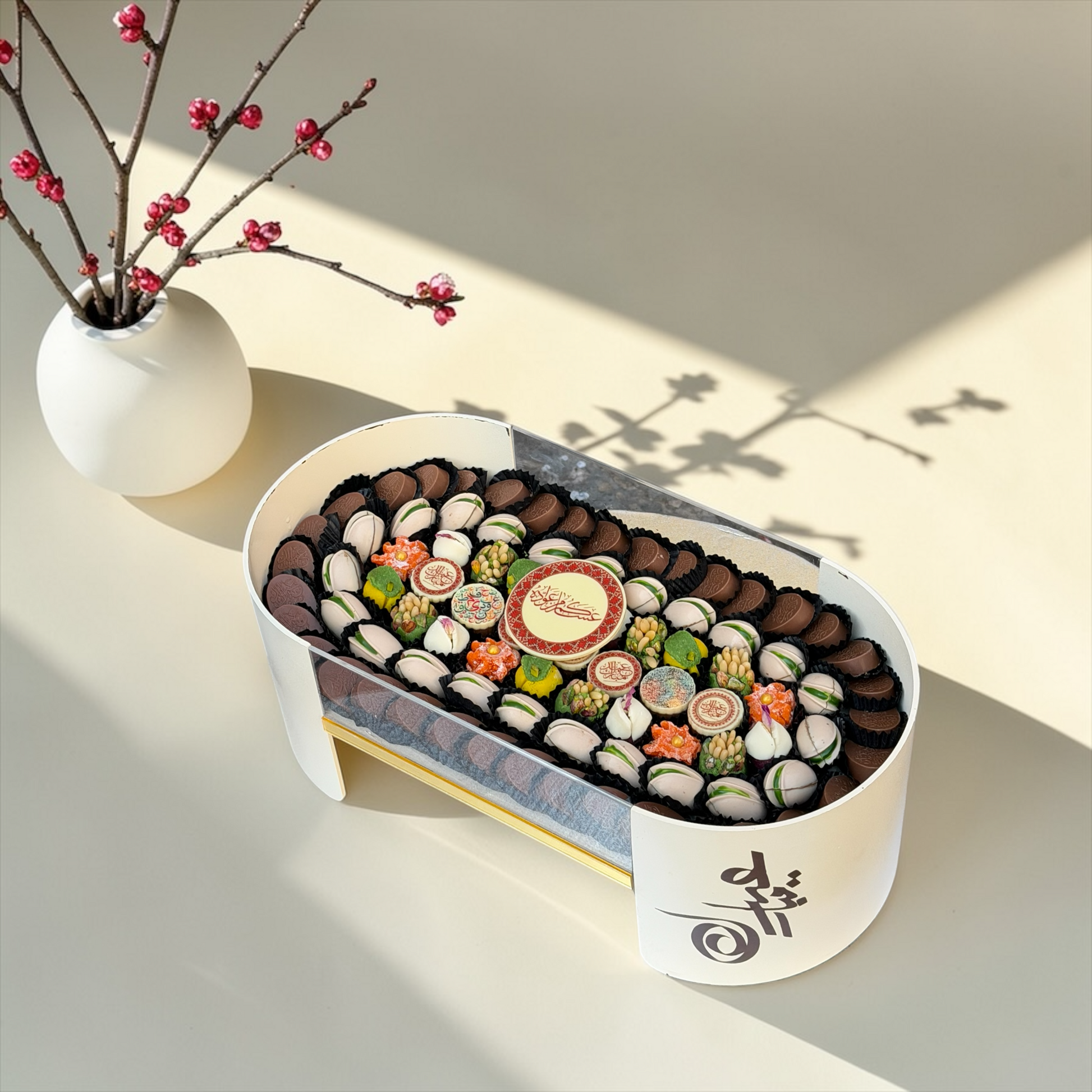 تم ترتيب هذه التشكيلة بعناية داخل بوكس اكريليك بيضاوي فاخر بتصميم أنيق ليكون خيارًا مثاليًا للهدايا الراقية وضيافة المناسبات.