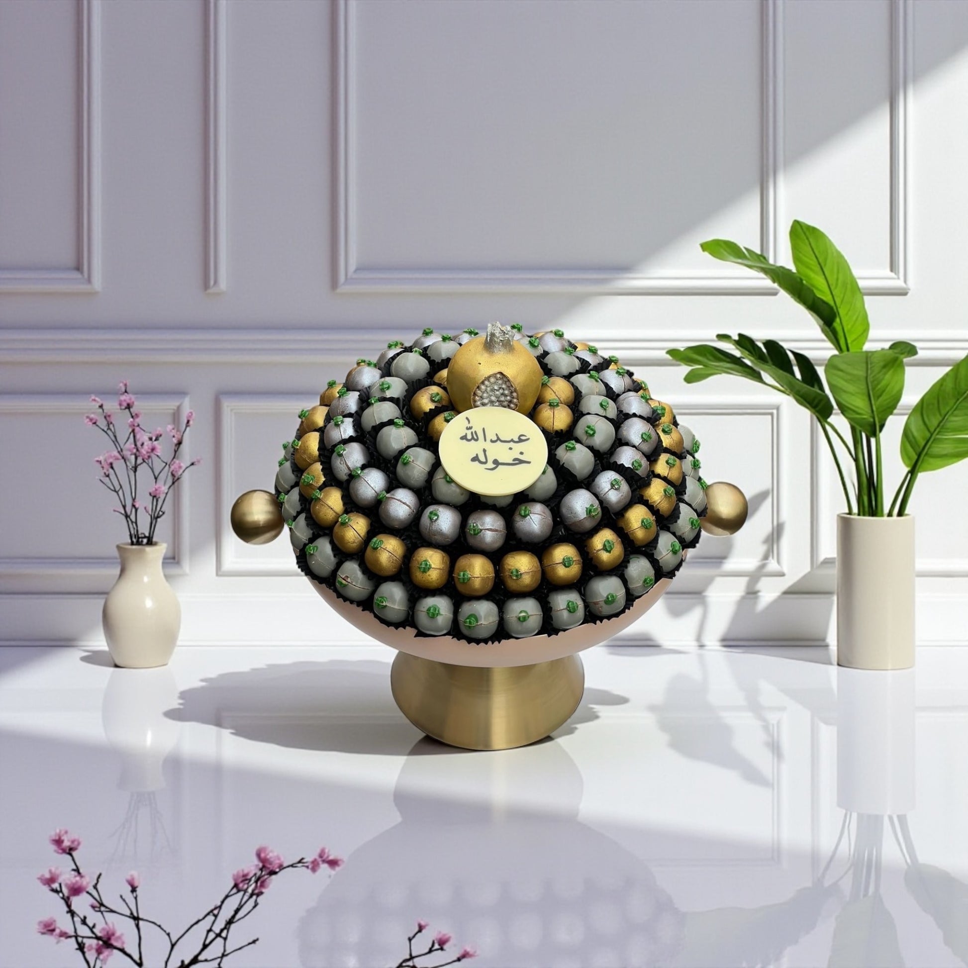 • يحتوي على تشكيلة شوكولاتة فاخرة مرتبة بعناية داخل صحن ميتال لكشري بقاعدة أنيقة.
