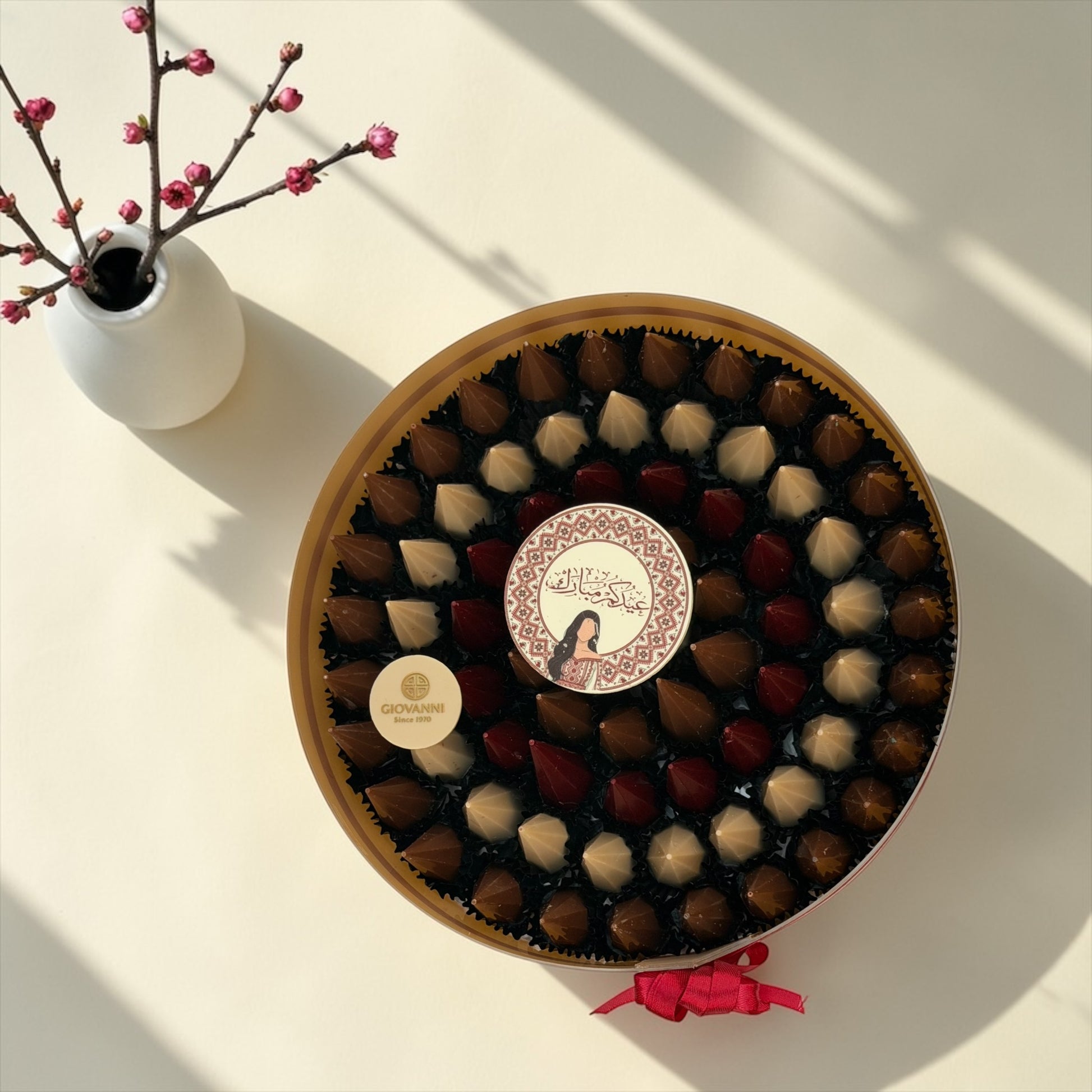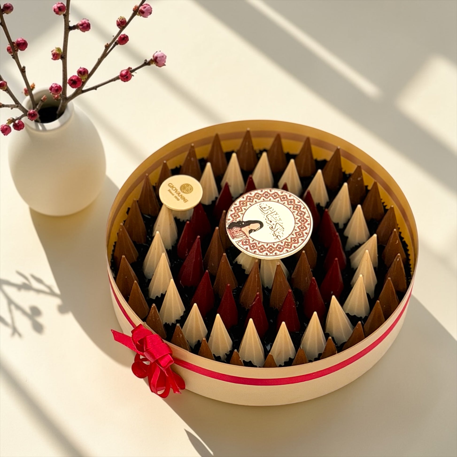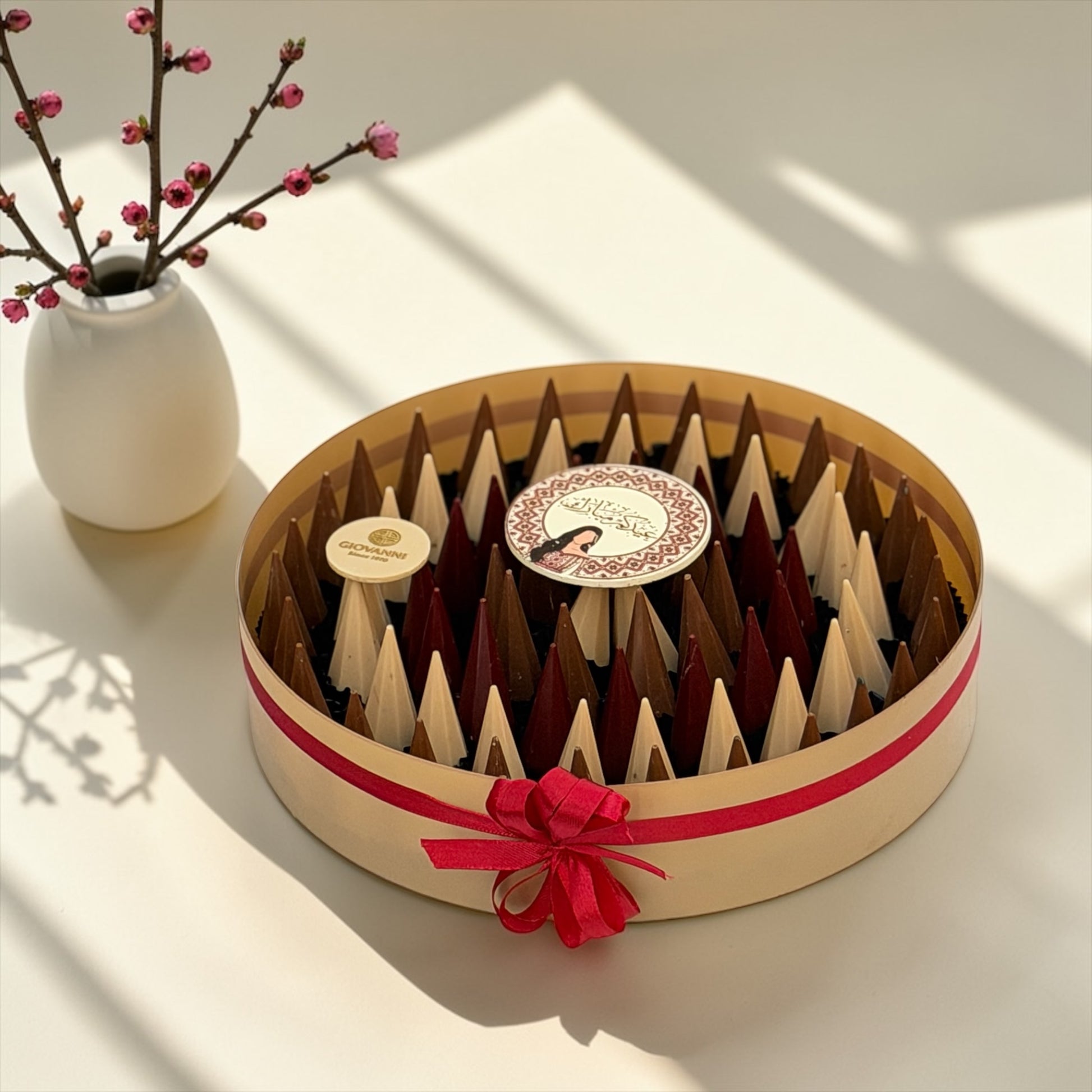 A luxury chocolate pyramid designed with an elegant Eid theme, featuring beautifully printed chocolate pieces arranged in a refined pyramid presentation. Crafted from premium Belgian chocolate, this selection delivers a rich flavor and an eye-catching display perfect for celebrations and gifting.