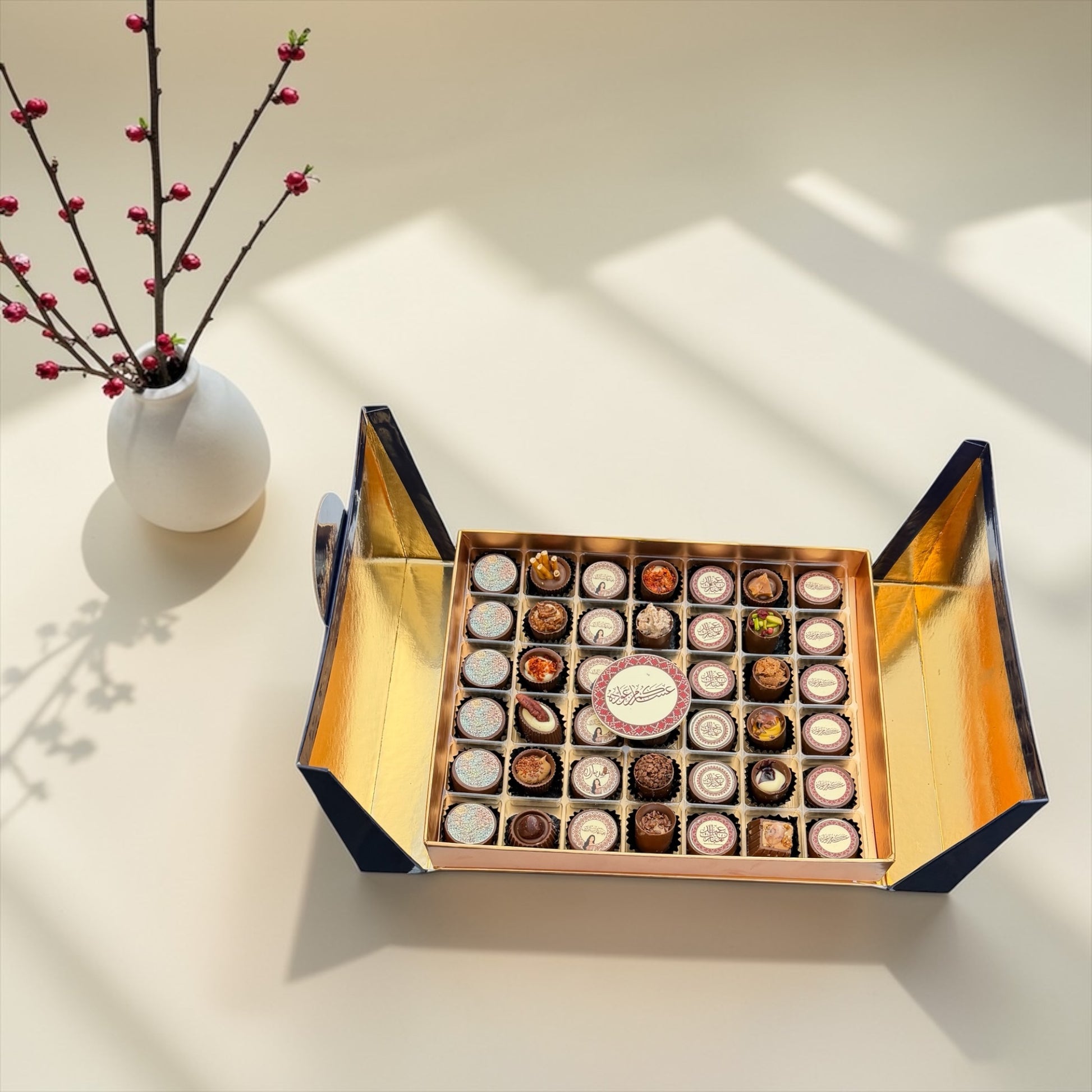 العدد: 42 قطعة شوكليت • يحتوي على: شوكليت مطبوع بثيم العيد كاب شوكليت بحشوات مميزة • ضيافة العيد
