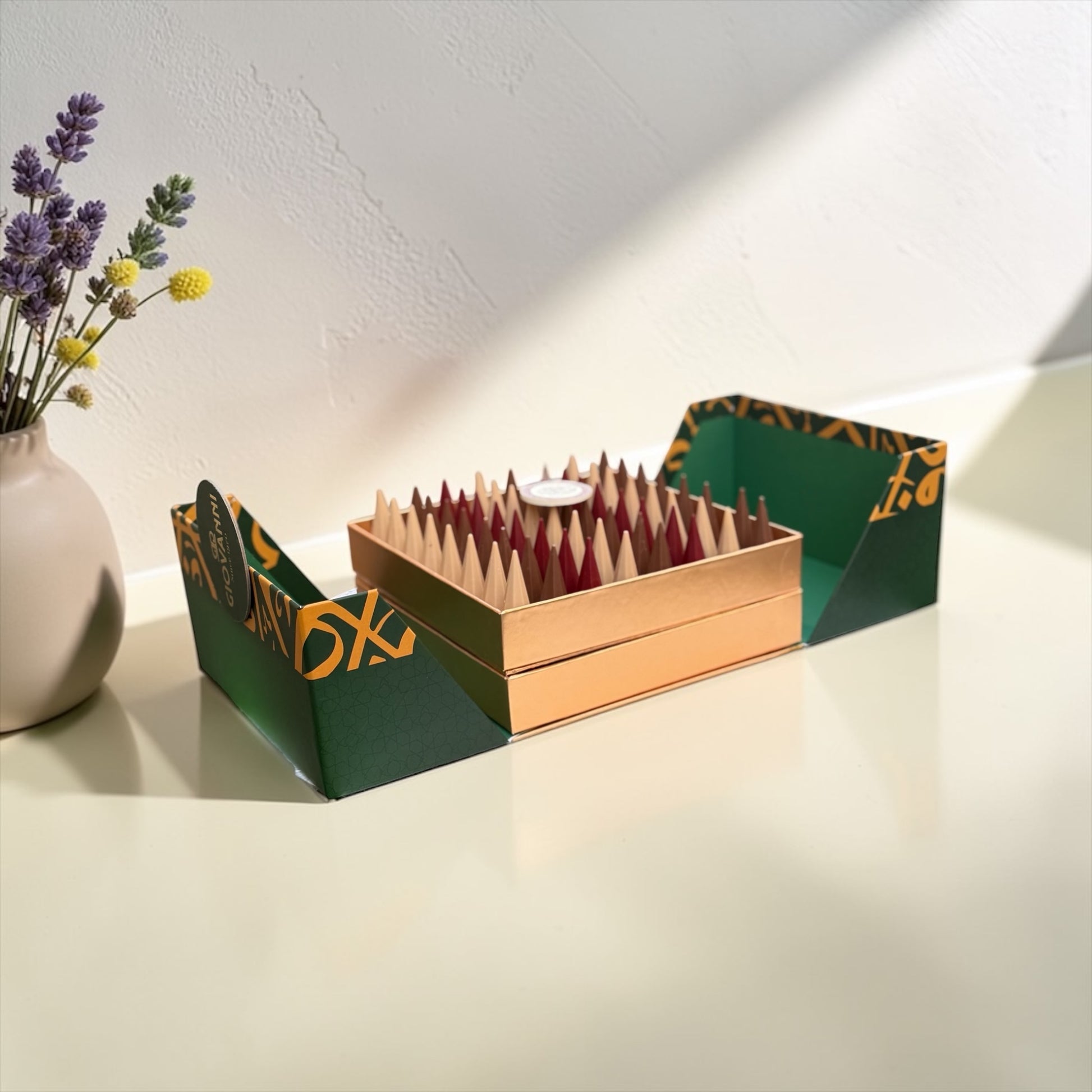 A luxury Arabesque chocolate box featuring two elegant layers filled with premium assorted chocolates. Carefully arranged to offer a refined and balanced selection, this box combines different chocolate styles and textures to create a rich and elegant gifting experience.