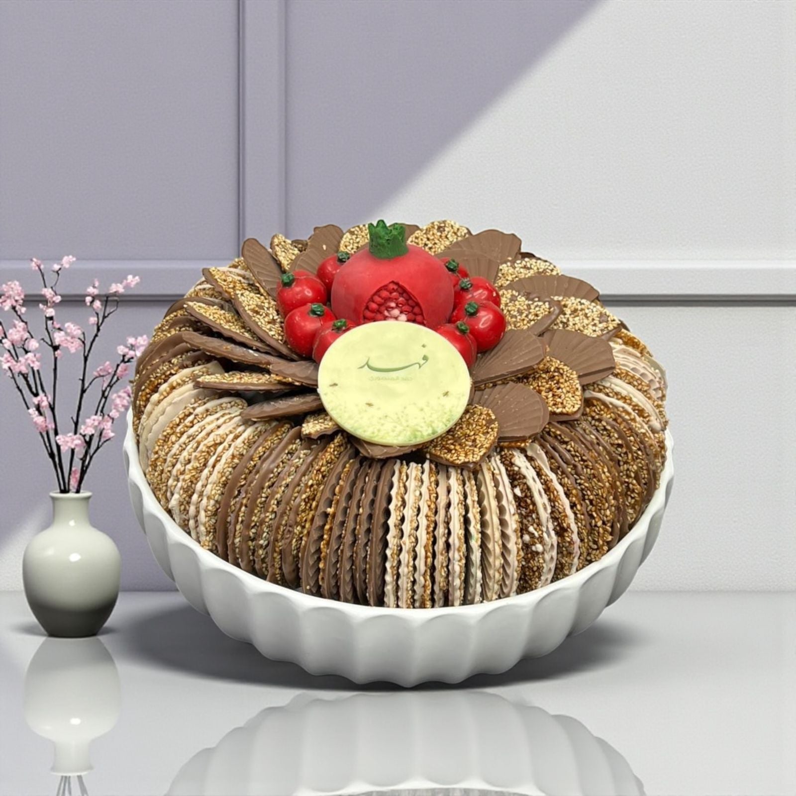 مزيج فاخر من السمسم المكرمل المغطى بالشوكولاتة البلجيكية، يُقدم في طبق كريستالي أنيق يضفي لمسة راقية على أي مناسبة. مقرمش، غني، ولا يُقاوم.