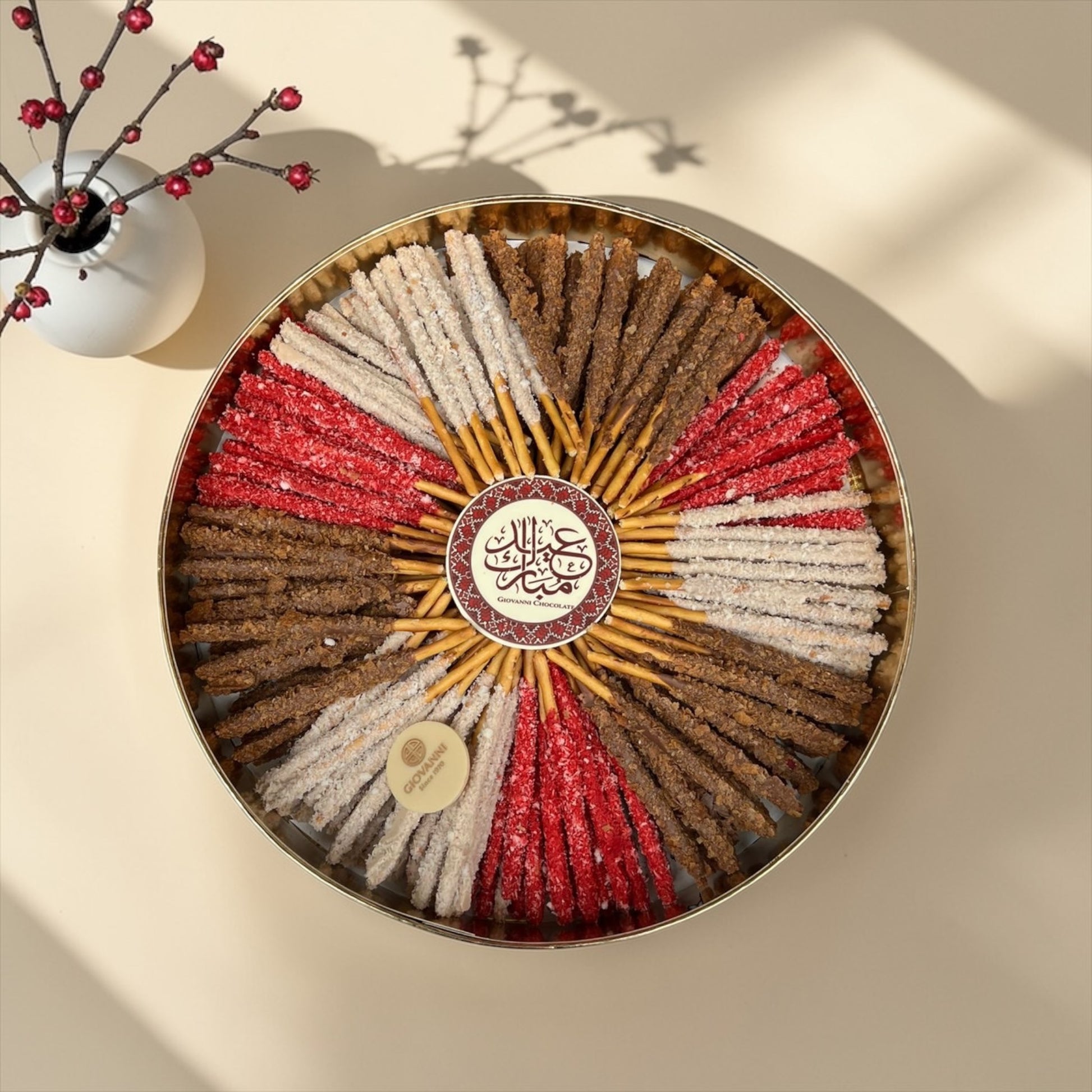 يحتوي على: عيدان بسكويت بولندي مملحة • ضيافة العيد طاولات السناكس والموالح التقديم مع القهوة أو الشاي • مصنوعة من شوكليت بلجيكي فاخر • تقديم فاخر مناسب للهدايا