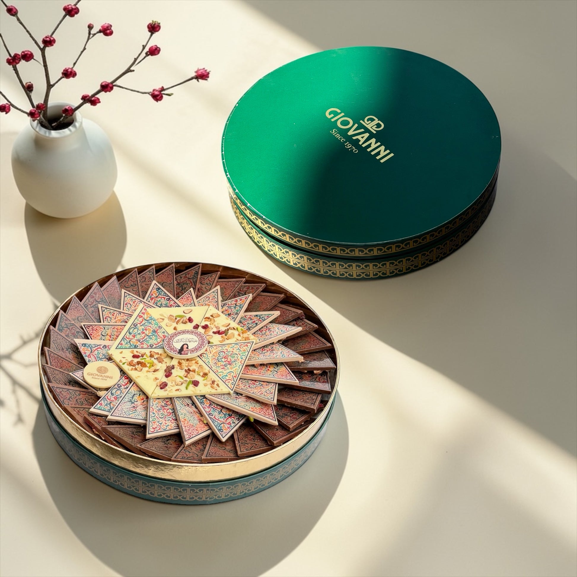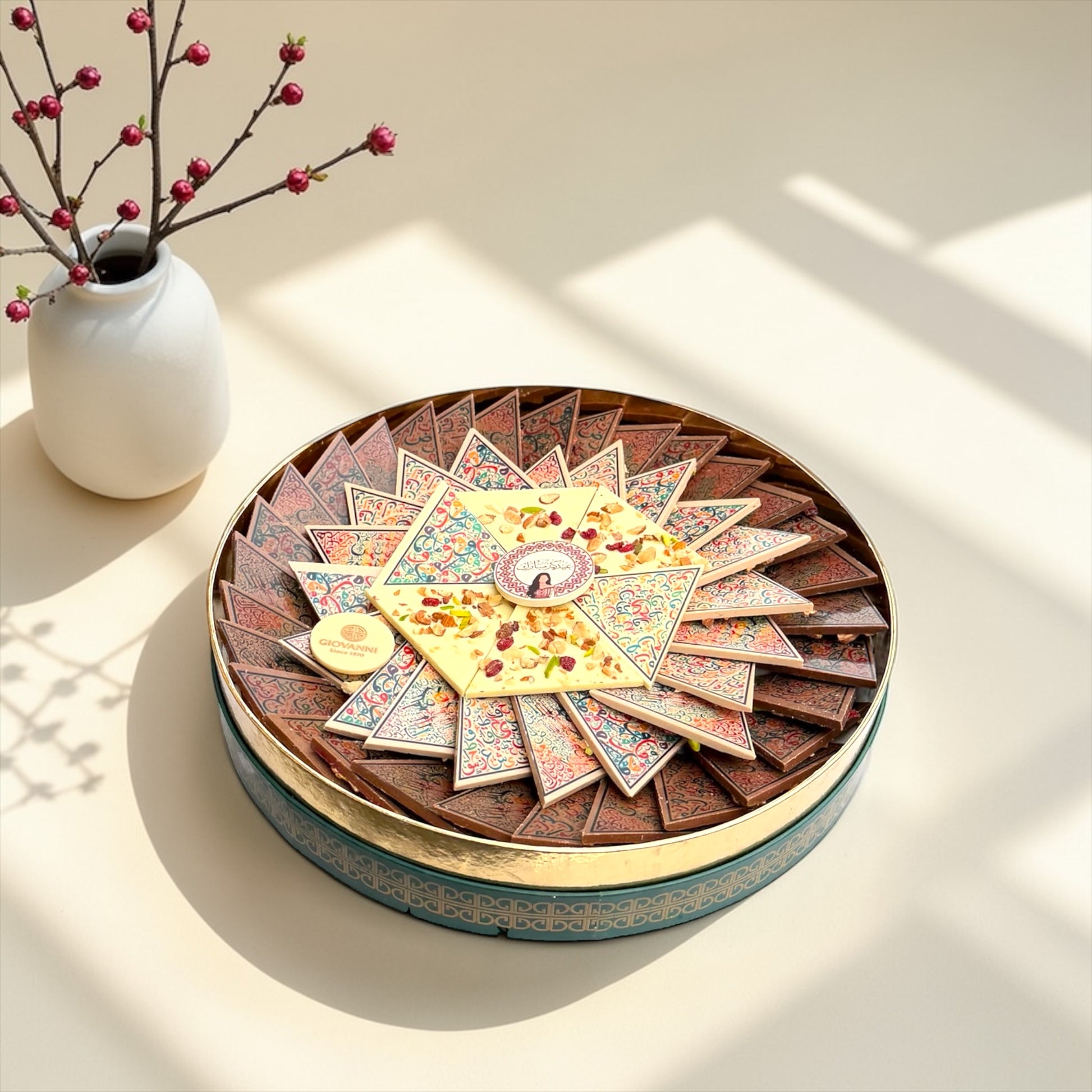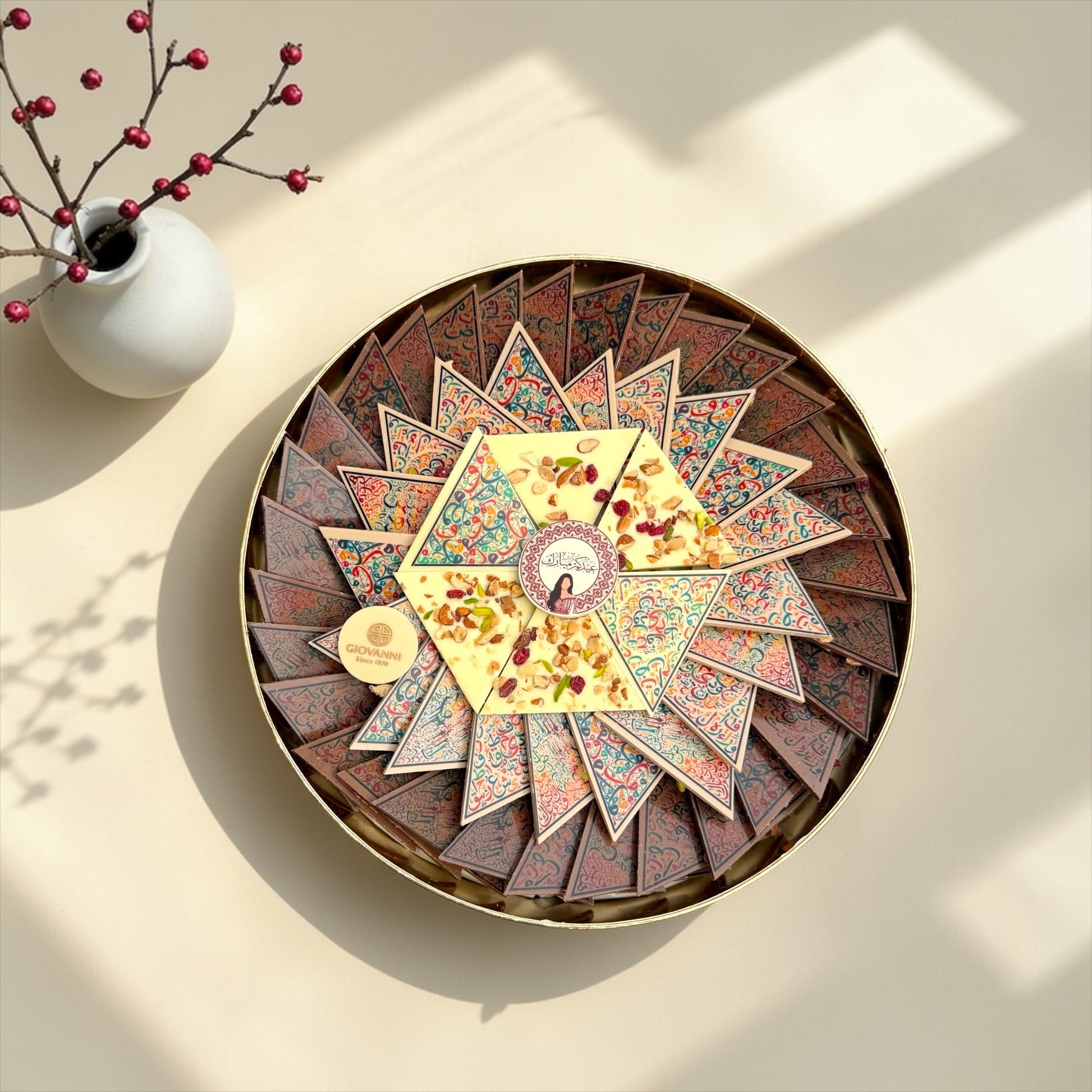 • بوكس شوكليت فاخر يحتوي على تشكيلة من الشوكليت بشكل مثلثات مزينة بطباعة مميزة مع المكسرات.